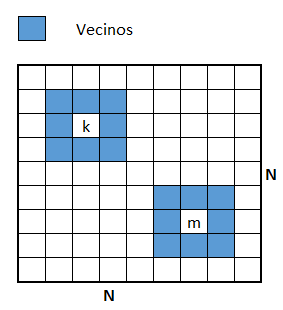 Fig. Tablero de NxN posiciones y vecindades del agente k y m